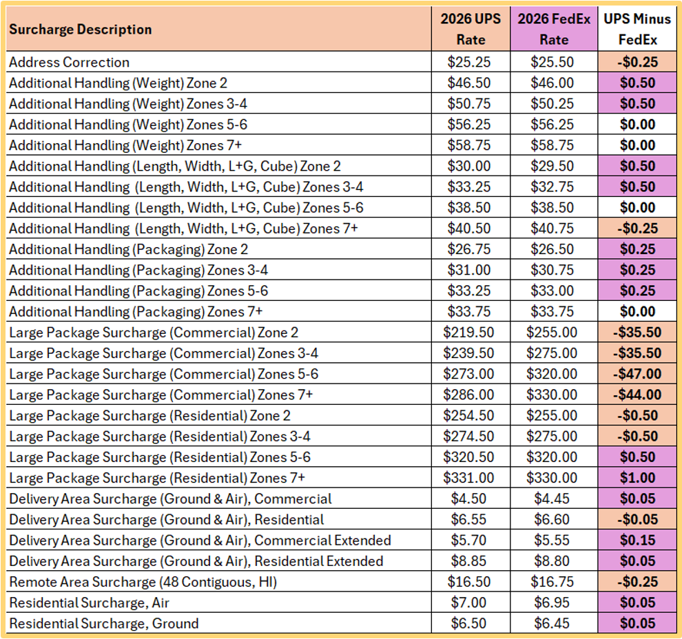 When Matt compared FedEx and UPS surcharges side by side, most line items were within a few cents of each other. A few categories, like large package and oversize for commercial shipments, showed much larger gaps. Shippers who do not track those deltas over time risk significant unplanned spend.
