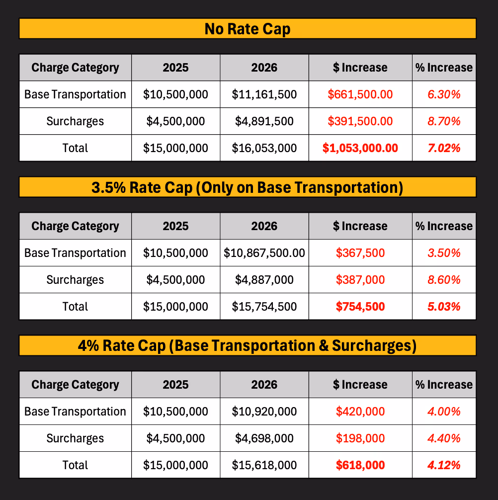 3.5% cap on base rates only: total increase drops to 5.03%, but surcharges still climb 8.6%.
