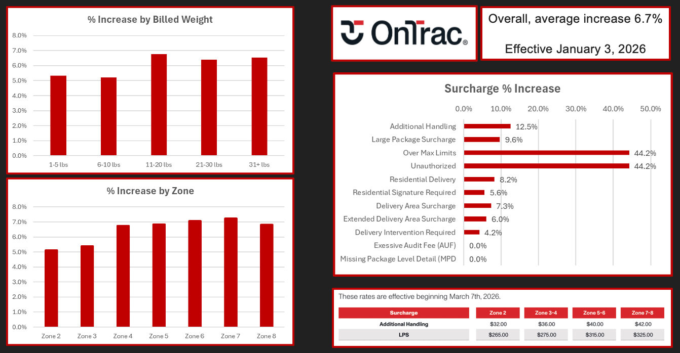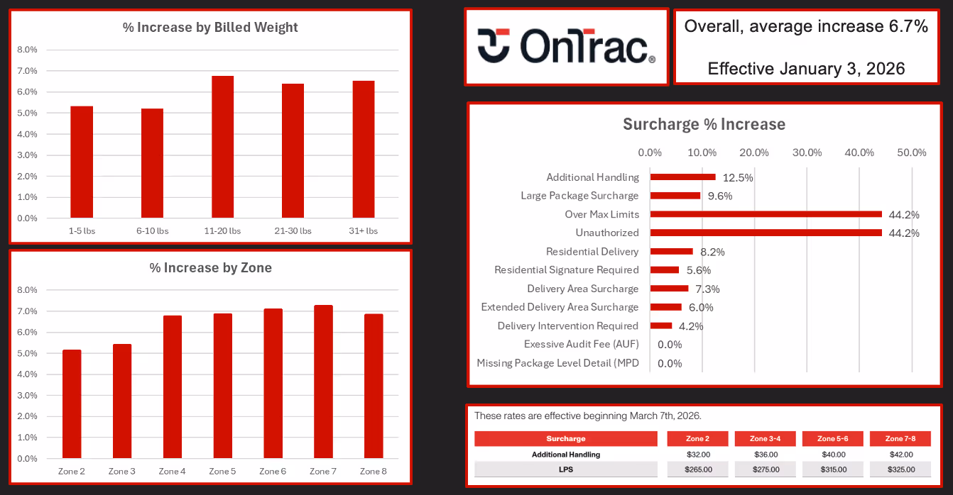 OnTrac is implementing an average 6.7% increase, with heavier hikes in the 11–20 lb band and in mid-to-long zones. Surcharges like Additional Handling, Large Package, and Over-Max are rising by double digits, with Over-Max and Unauthorized Charges up more than 40%.