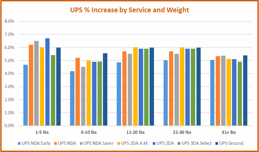 UPS looks flatter by zone at first glance, with most Ground zones sitting in the mid-5% range. Once you shift the lens to weight breaks, it becomes clear that UPS is targeting 1–5 lb and 11–30 lb shipments, which has major implications for e-commerce and residential shippers.