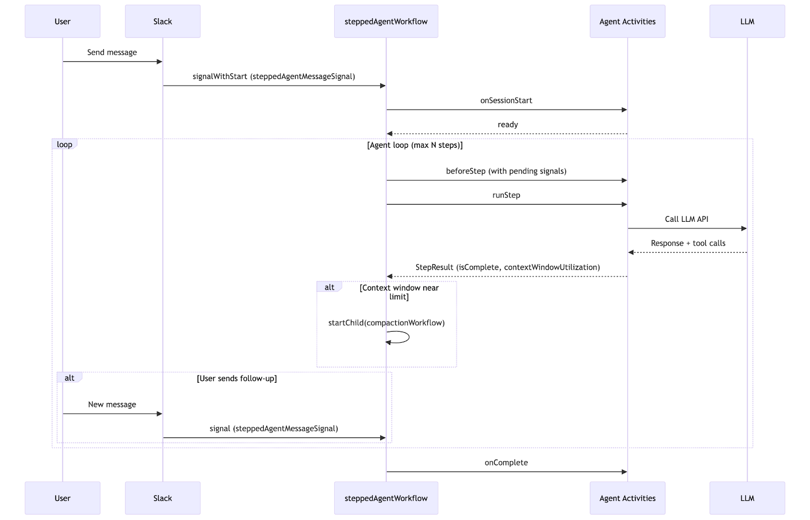 October 2025: The "stepped workflow" pattern was extracted from the Slack bot implementation and applied to the rules engine rule author agent. The pattern: instead of one long-running activity that runs the entire agent loop, each "step" (one LLM call + tool execution cycle) is its own activity. This gives Temporal visibility into each step's input/output, enables per-step heartbeating, and allows the workflow to checkpoint progress between steps.